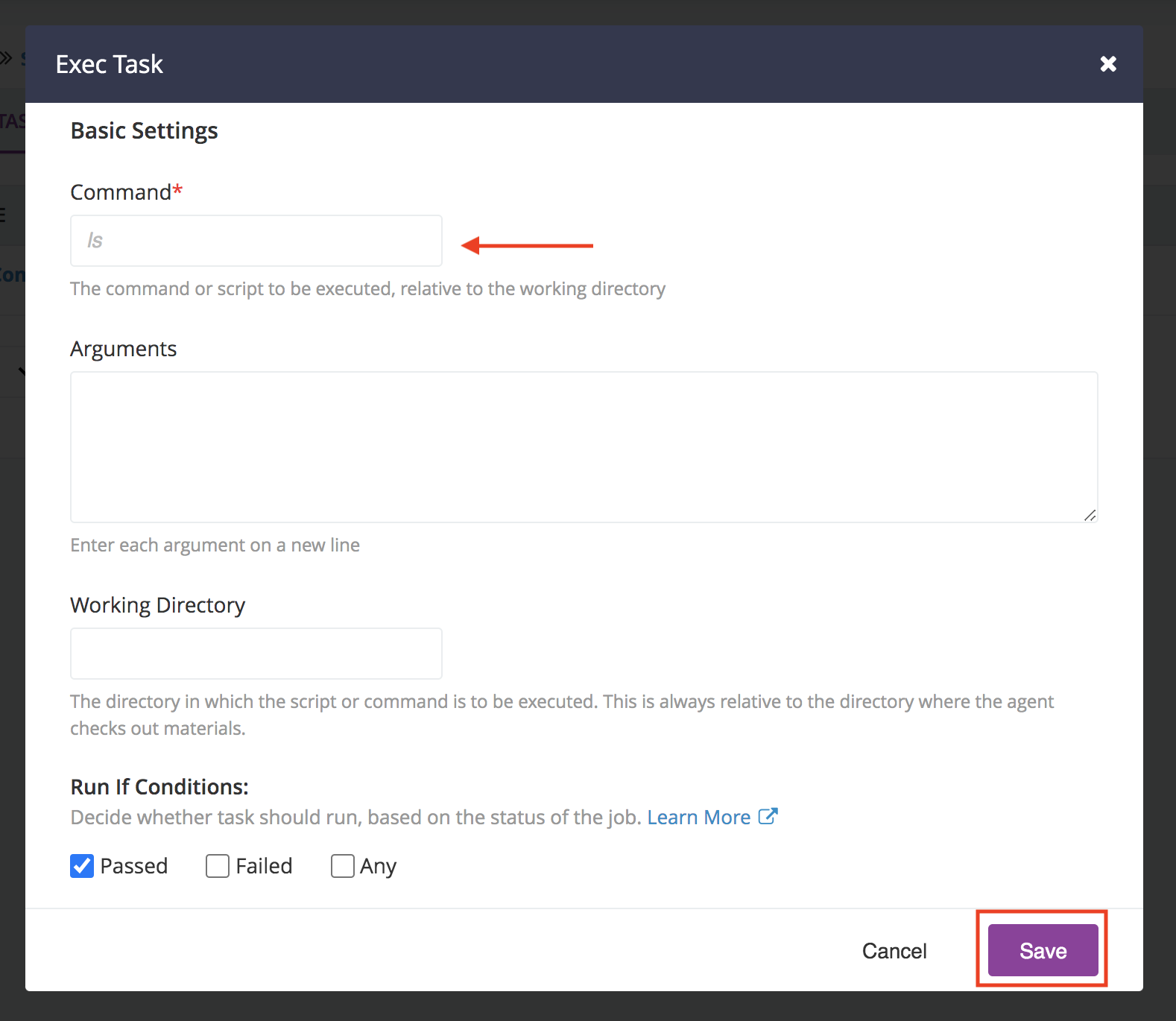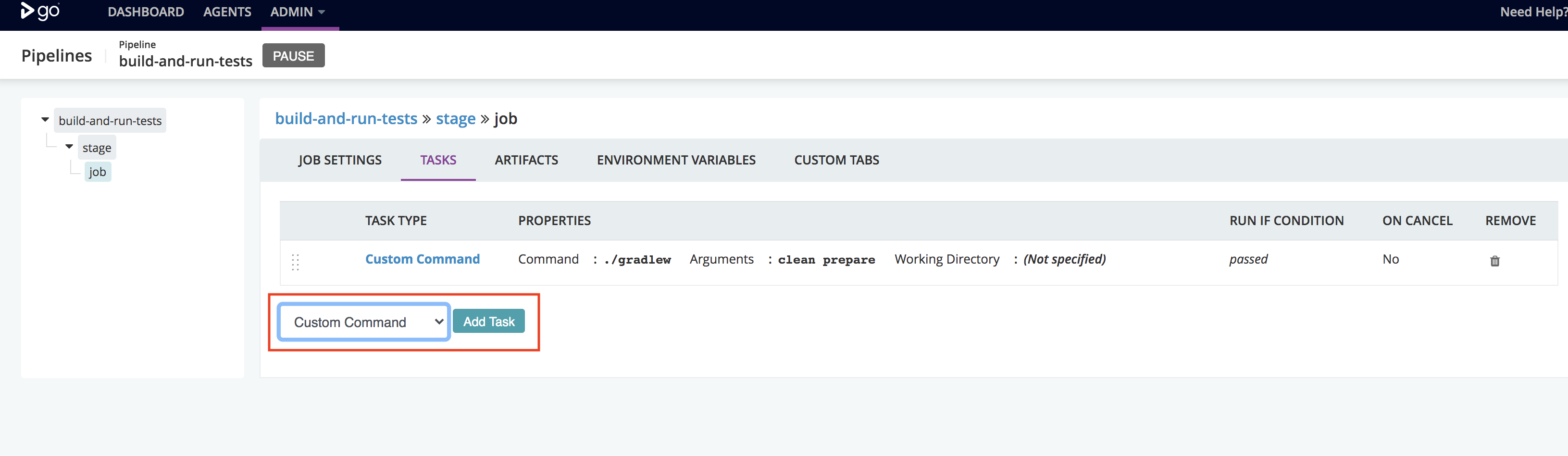 - Click on “Add new task”. You can choose the task type from Ant, Nant, Rake and Fetch Artifact. Or you can choose “Custom Command” to specify your own command