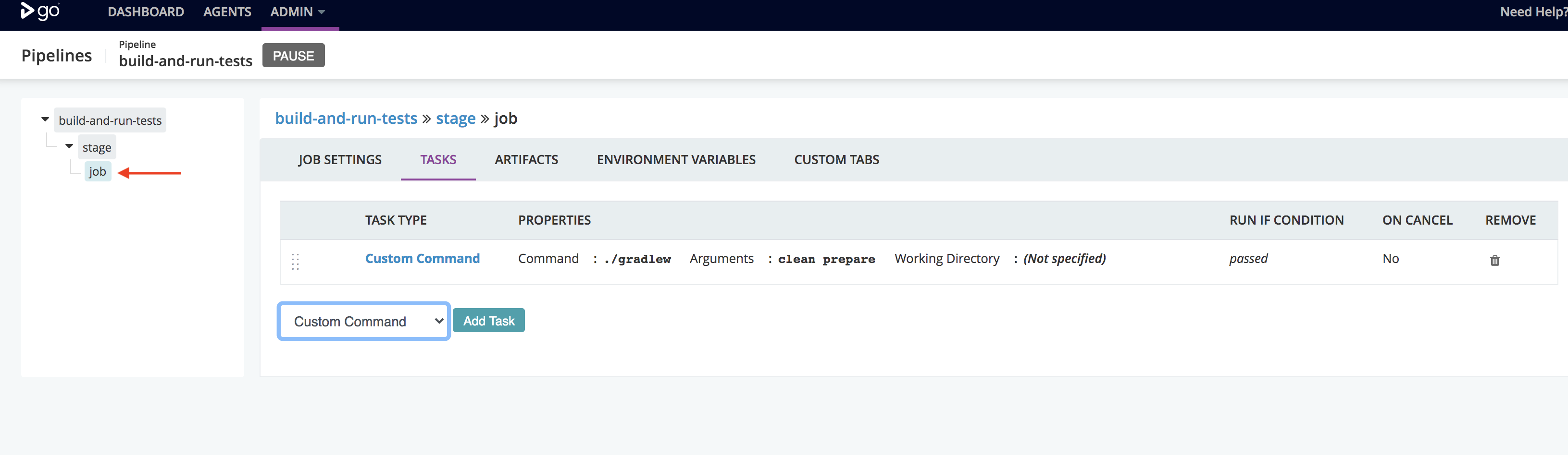 Now that we have a pipeline with stage(s) containing job(s) we can add tasks to any of the existing jobs. You can now use the tree navigation on the left side of the screen to edit a job under a stage.