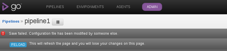User should backup the required changes from the page. Clicking on ‘RELOAD’ button, would discard user’s changes and reload the page with latest version of the pipeline configuration. User should re-apply his/her changes from backup and save again.