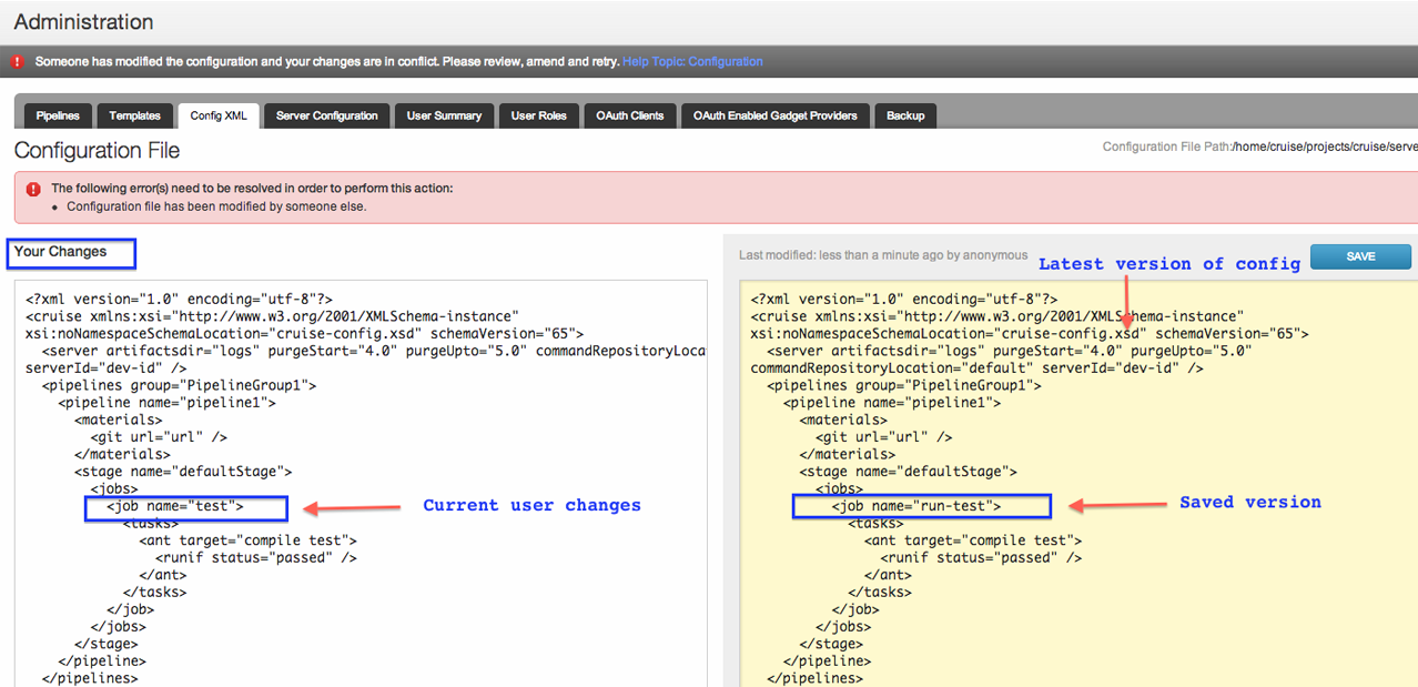 In case of a conflict, GoCD provides an interface with the latest version of config along with the changes made by the user. As an example, if the same job was re-named by two users concurrently, the changes from first user would be successfully saved while the second user would see a page similar to the one displayed in the image below.
